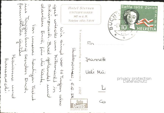 11630906 alte Postkarte Unterwasser Toggenburg Hotel Sternen postalisch gelaufen Erhaltung siehe scans KatCode: 11470190585770
