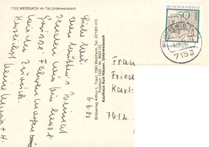 73901070 alte Postkarte Unterweissach Rathaus und ev Kirche postalisch gelaufen Erhaltung siehe scans [WerneD78] KatCode: 11110008119083