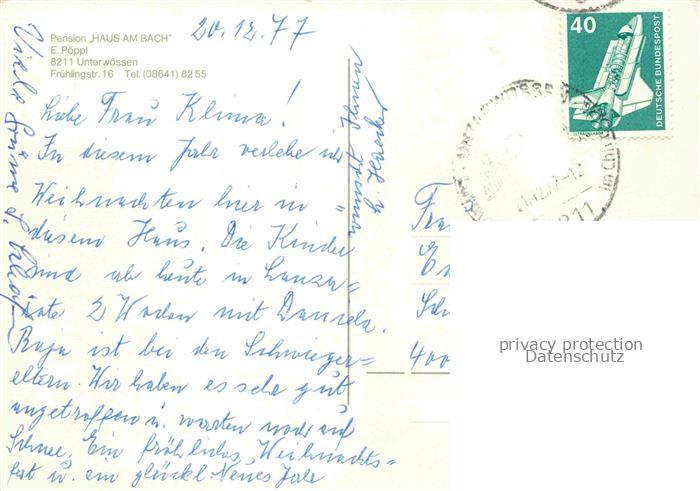 74100236 alte Postkarte Unterwoessen Bayern Pension Haus am Bach postalisch gelaufen Erhaltung siehe scans [FriedD77] KatCode: 11110009189160