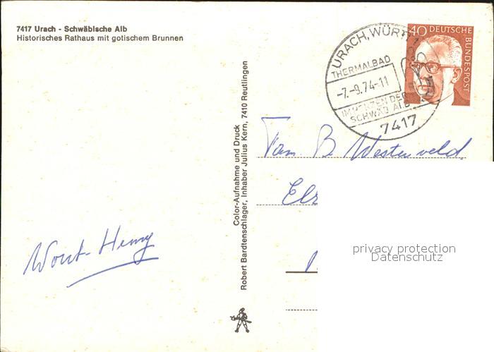 72607800 alte Postkarte Urach Bad Rathaus mit Brunnen Fachwerk postalisch gelaufen Erhaltung siehe scans [LiesaD40] KatCode: 11110008415078