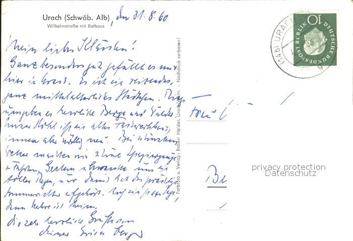 alte Postkarte Urach Bad Wilhelmstrasse mit Rathaus Fachwerkhaus Schild postalisch gelaufen Erhaltung siehe scans