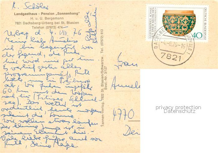73256673 alte Postkarte Urberg Landgasthaus Sonnenhang postalisch gelaufen Erhaltung siehe scans [NatalD47] KatCode: 11110008337027
