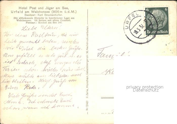 32572935 alte Postkarte Urfeld Walchensee Hotel Post und Jaeger postalisch gelaufen Erhaltung siehe scans [WerneD78] KatCode: 11110009173133