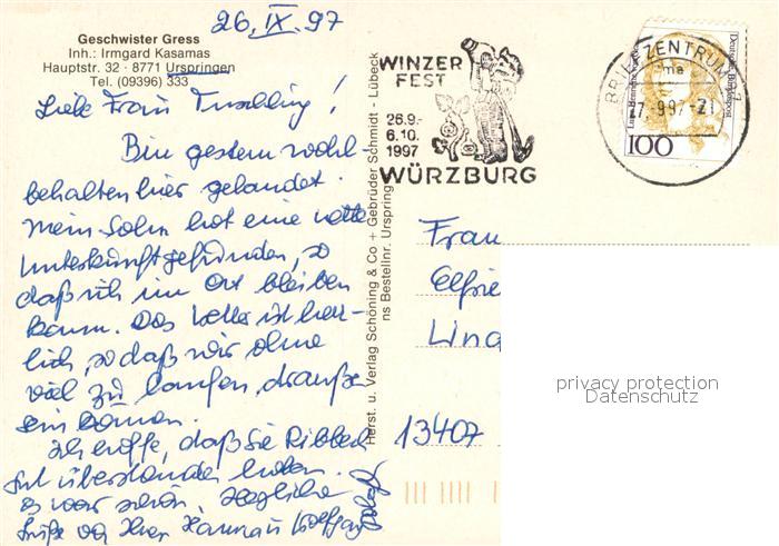 73672827 alte Postkarte Urspringen Marktheidenfeld Kirche Panorama Wohnhaeuser postalisch gelaufen Erhaltung siehe scans [WerneD78] KatCode: 11110009677193