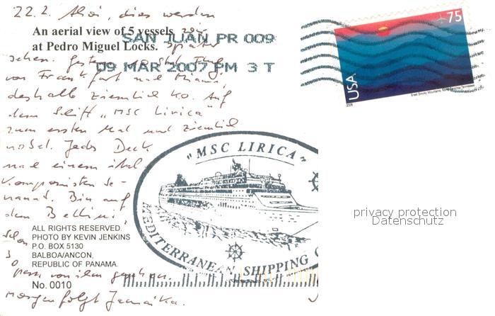 73714646 old postcard USA Fliegeraufnahme 5 vessels at Pedro Miguel Locks postalisch gelaufen Erhaltung siehe scans [LiesaD40] KatCode: 14140
