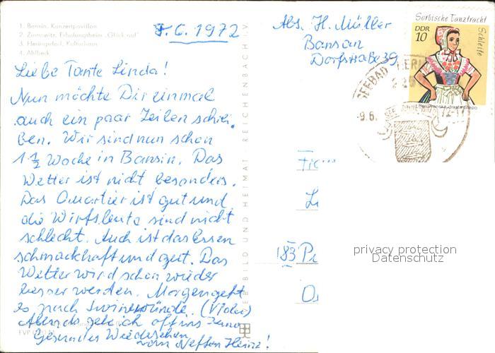 72416995 alte Postkarte Usedom Mecklenburg-Vorpommern Bansin Konzertpavillon Zinnowitz Erholungsheim Glueck auf Heringsdorf Kulturhaus Ahlbeck postalisch gelaufen Erhaltung siehe scans KatCode: 11110013059097