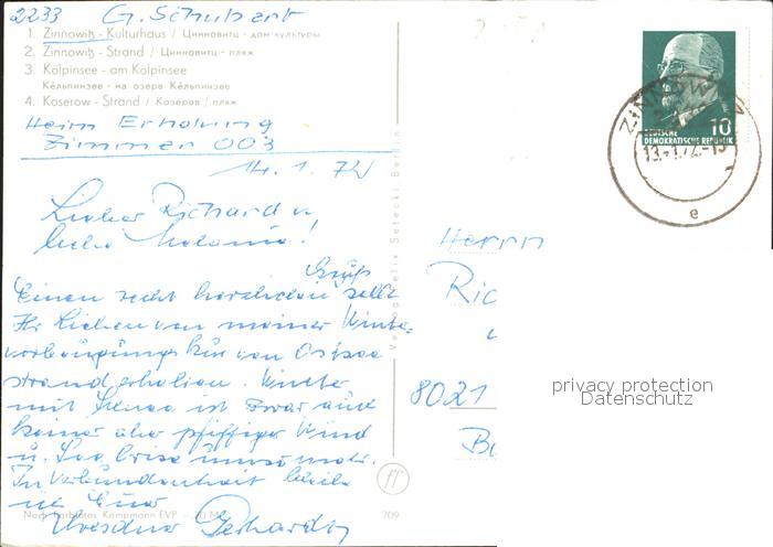 72285596 alte Postkarte Usedom Mecklenburg-Vorpommern Zinnowitz Kulturhaus Strand Koelpinsee Koserow Strand postalisch gelaufen Erhaltung siehe scans KatCode: 11110013059097