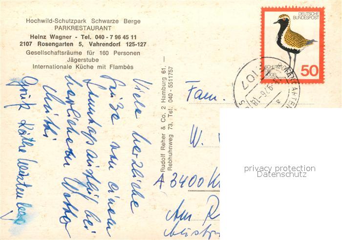 73163658 alte Postkarte Vahrendorf Siedlung Parkrestaurant Hochwild Schutzpark Schwarze Berge Schwanenteich postalisch gelaufen Erhaltung siehe scans [FriedD77] KatCode: 11110003353029