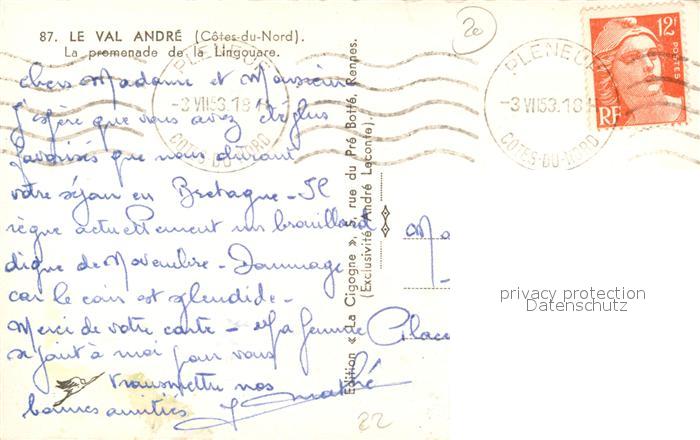 13501281 carte postale Val-Andre La promenade de la Lingouare postalisch gelaufen Erhaltung siehe scans [KathaD81] KatCode: 11170022422186