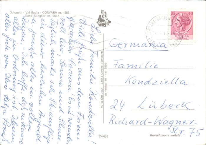 old postcard Val Badia Corvara e Sass Sangher Dolomiti postalisch gelaufen Erhaltung siehe scans