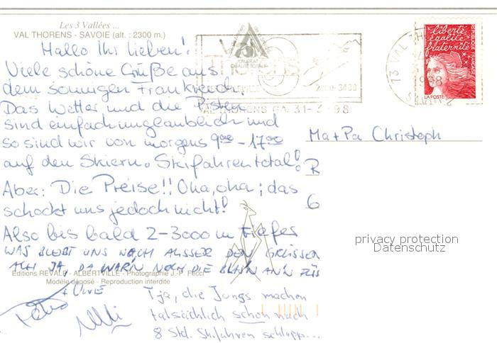 13358207 carte postale Val Thorens Savoie Panorama Wintersportplatz Alpen Snowboardfahrer postalisch gelaufen Erhaltung siehe scans [FriedD77] KatCode: 11170073173257