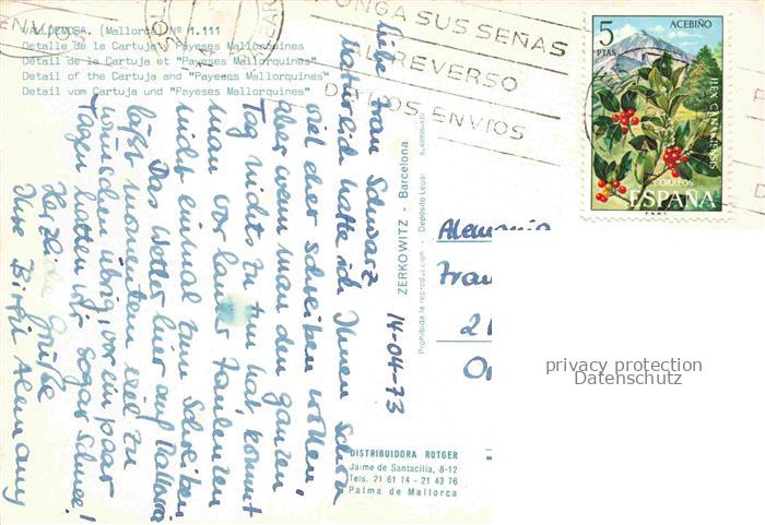 74005798 old postcard Valldemosa Valldemossa Mallorca ES Detalle de la Cartuja y Payeses Mallorquines postalisch gelaufen Erhaltung siehe scans [FriedD77] KatCode: 11510