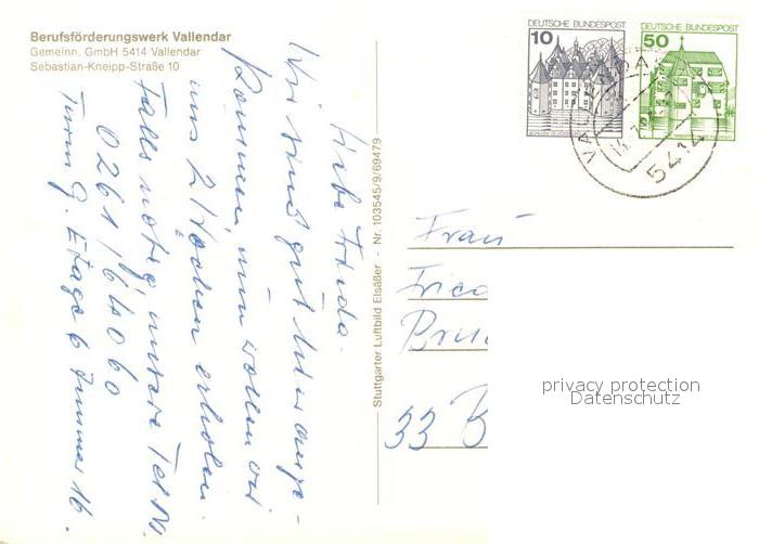 73175743 alte Postkarte Vallendar Fliegeraufnahme Berufsfoerderungswerk postalisch gelaufen Erhaltung siehe scans [NatalD47] KatCode: 11110007137226