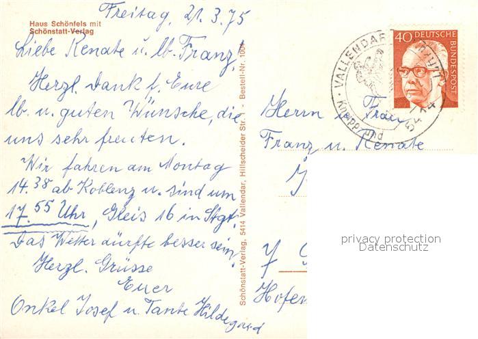 73009173 alte Postkarte Vallendar Haus Schoenfels postalisch gelaufen Erhaltung siehe scans [WerneD78] KatCode: 11110007137226