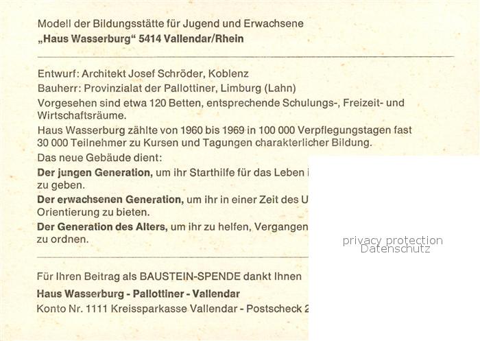 73126026 Vallendar Haus Wasserburg Modell der Bildungsstaette fuer Jugend und Erwachsene postalisch nicht gelaufen Keine Postkarte (siehe scan) Erhaltung siehe scans [FriedD77] KatCode: 11110007137226