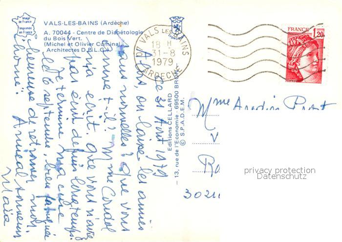 13548391 carte postale Vals-les-Bains Centre de Diabétologie du Bois Vert postalisch gelaufen Erhaltung siehe scans [FriedD77] KatCode: 11170007107331