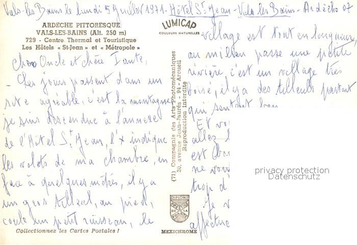 Vals-les-Bains Centre Thermal et Touristique Hôtels Saint Jean et Metropole postalisch nicht gelaufen Erhaltung siehe scans [FriedD77]