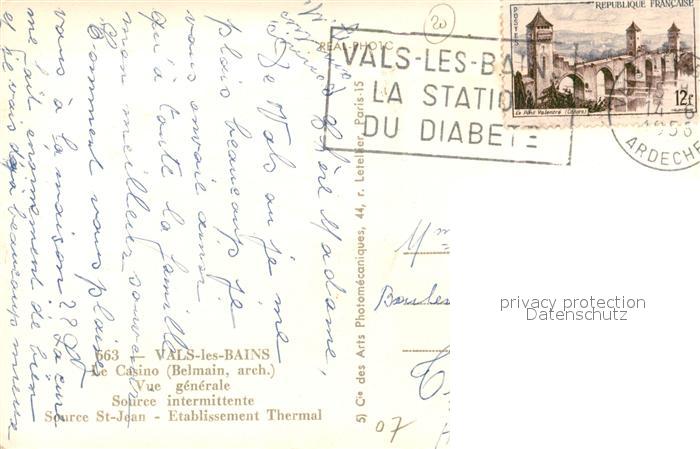 13490830 carte postale Vals-les-Bains Le Casino Vue generale Source intermittente Source St Jean Etablissement Thermal postalisch gelaufen Erhaltung siehe scans [WerneD78] KatCode: 11170007107331