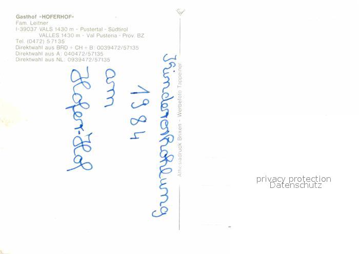72716559 Vals Tirol Gasthof Hoferhof postalisch nicht gelaufen Erhaltung siehe scans [LiesaD40] KatCode: 11390332070362