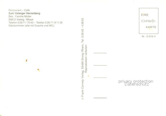 73648856 Valwig Restaurant Cafe Zum Valwiger Herrenberg Terrasse Cornely Karte Nr. 12916 H postalisch nicht gelaufen Erhaltung siehe scans [FriedD77] KatCode: 11110007135086
