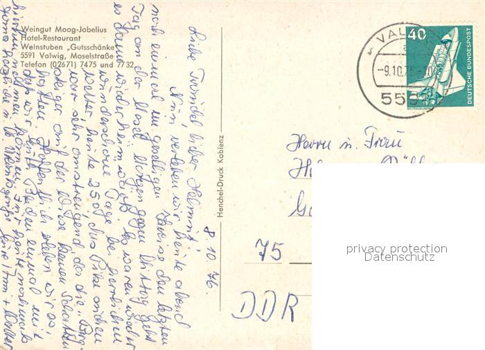 73646725 alte Postkarte Valwig Weingut Moot Jobelius Hotel Restaurant Weinstube Gutsschaenke postalisch gelaufen Erhaltung siehe scans [WerneD78] KatCode: 11110007135086