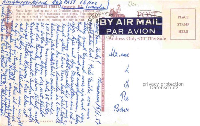 74128755 old postcard VANCOUVER BC Canada Granville Street postalisch gelaufen Erhaltung siehe scans [FriedD77] KatCode: 14110