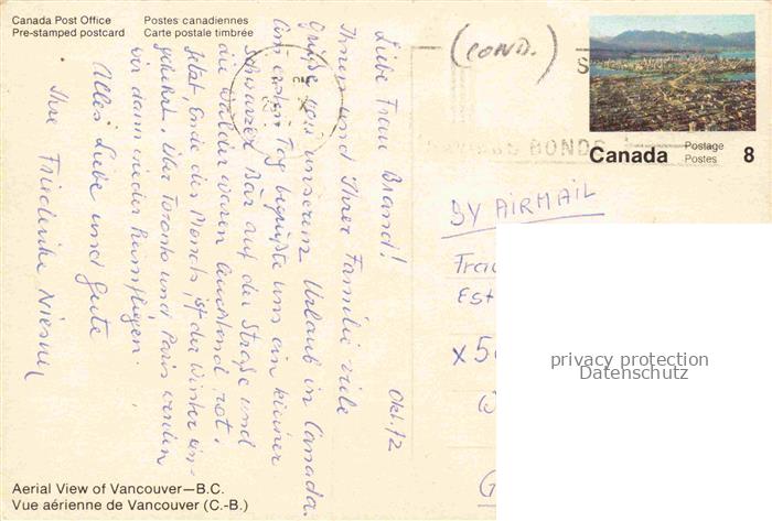 74157640 old postcard VANCOUVER BC Canada Vancouver Skyline Bruecke Hafen Berge Luftbild Grossstadt postalisch gelaufen Ganzsache (eingedruckte Briefmarke) Erhaltung siehe scans [Karloger] KatCode: 14110