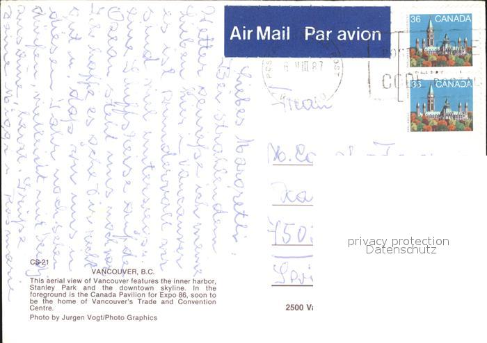 old postcard Vancouver British Columbia Aerial view Harbour Stanley Park and downtown Skyline Canada Pavilion for Expo 86 postalisch gelaufen Erhaltung siehe scans [WerneD78 kt117box]
