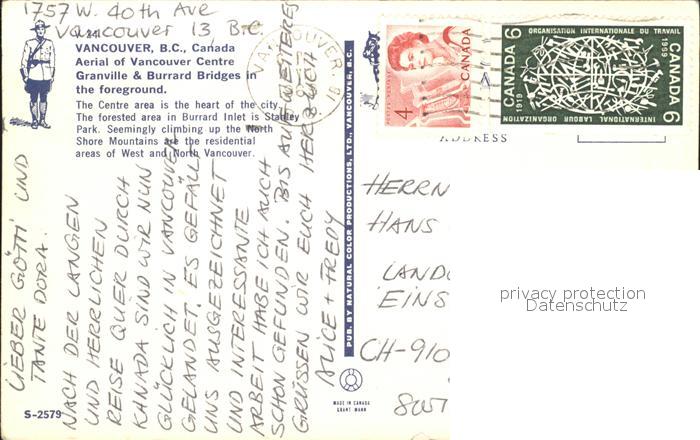old postcard Vancouver British Columbia Centre Granville Burrard Bridges Mountains aerial view postalisch gelaufen Erhaltung siehe scans