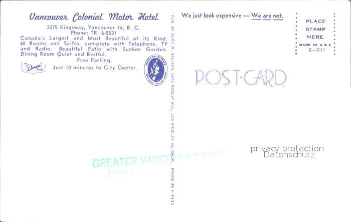 Vancouver British Columbia Colonial Motor Hotel postalisch nicht gelaufen Erhaltung siehe scans