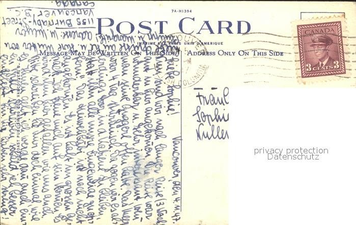 old postcard Vancouver British Columbia Fliegeraufnahme Brockton Point Stanley Park postalisch gelaufen Erhaltung siehe scans