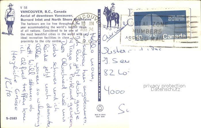 old postcard Vancouver British Columbia Luftaufnahme postalisch gelaufen