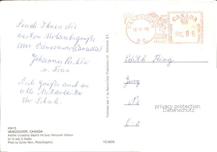 old postcard Vancouver British Columbia Skylin mit Personenschiff postalisch gelaufen Erhaltung siehe scans