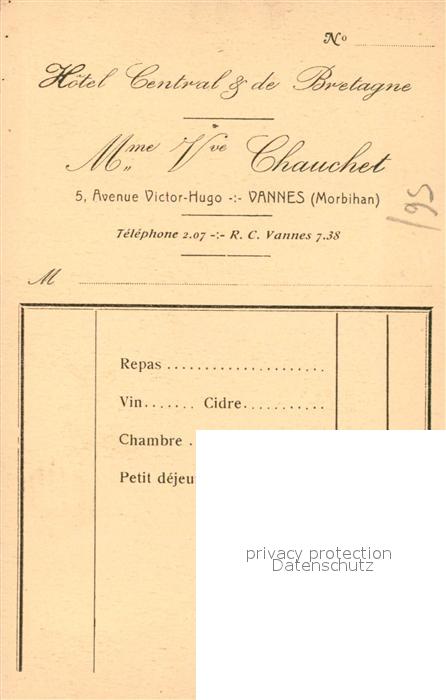 13541815 Vannes 56 Hotel Central postalisch nicht gelaufen Erhaltung siehe scans [KathaD81] KatCode: 11170056356260