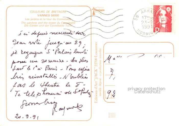 13266722 carte postale Vannes 56 Les jardins et la tour du Connétable Histoire postalisch gelaufen Erhaltung siehe scans [FriedD77] KatCode: 11170056356260