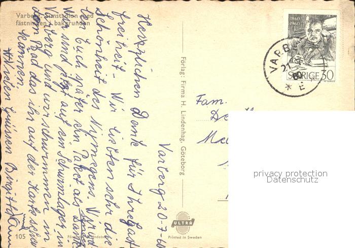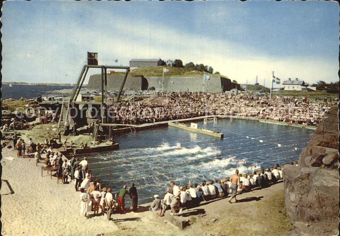 old postcard Varberg Simstadion med faestningen i bakgrunden Schwimmbad postalisch gelaufen Erhaltung siehe scans