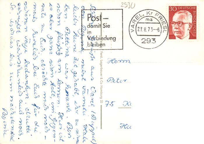 73934554 alte Postkarte Varel Jadebusen Muehle Autobahn Hallenbad Kirche Schlossplatz Hallenbad Rathaus Post postalisch gelaufen Erhaltung siehe scans [WerneD78] KatCode: 11110003455026