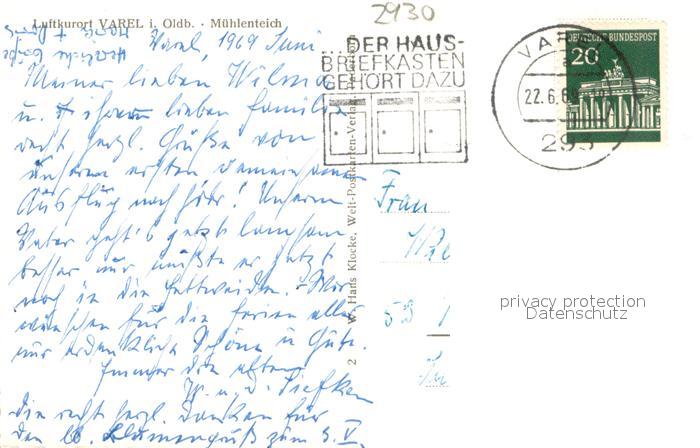 73695192 alte Postkarte Varel Jadebusen Uferpartie am Muehlenteich postalisch gelaufen Erhaltung siehe scans [FriedD77] KatCode: 11110003455026