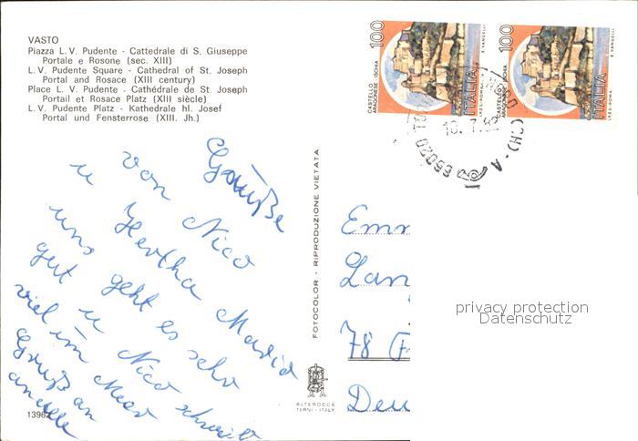 old postcard Vasto Pudente Platz Kathedrale Heiliger Josef postalisch gelaufen Erhaltung siehe scans