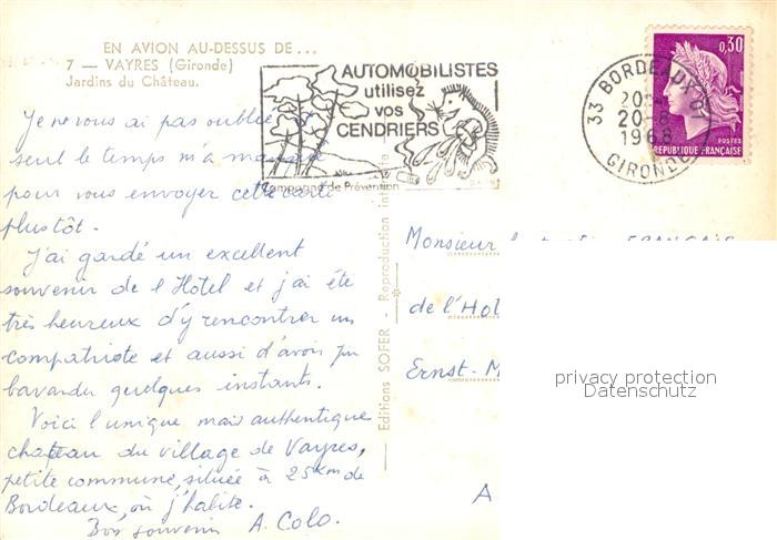 carte postale Vayres Gironde Jardins du Chateau vue aérienne postalisch gelaufen Erhaltung siehe scans [FriedD77]