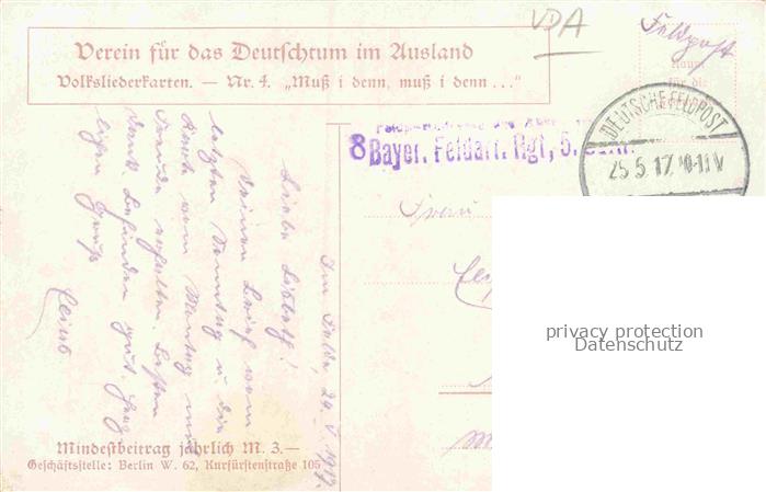 74137907 alte Postkarte VDA Volksliederkarte Nr.4 Verein Deutschtum Ausland Litho postalisch gelaufen Feldpost – Stempel Erhaltung siehe scans [SanaeD93] KatCode: 22560000003300