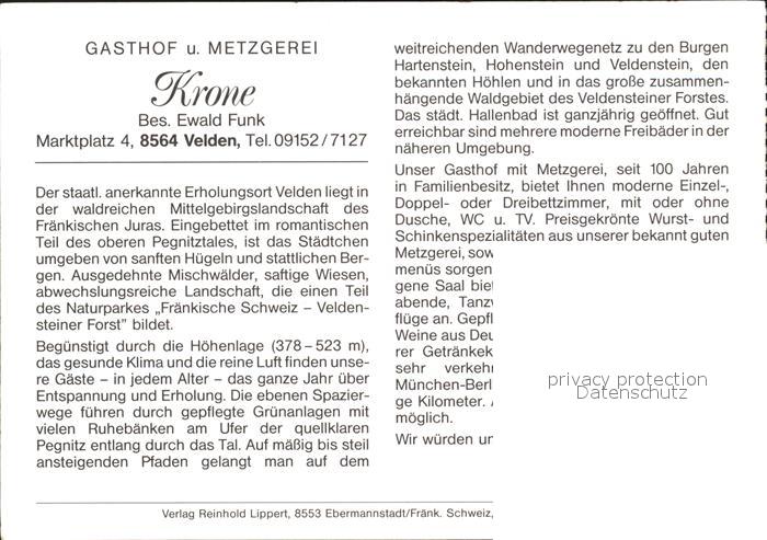 72102502 Velden Mittelfranken Gasthaus Metzgerei Krone postalisch nicht gelaufen Werbekarte (keine Postkarte) Erhaltung siehe scans KatCode: 11110009574160