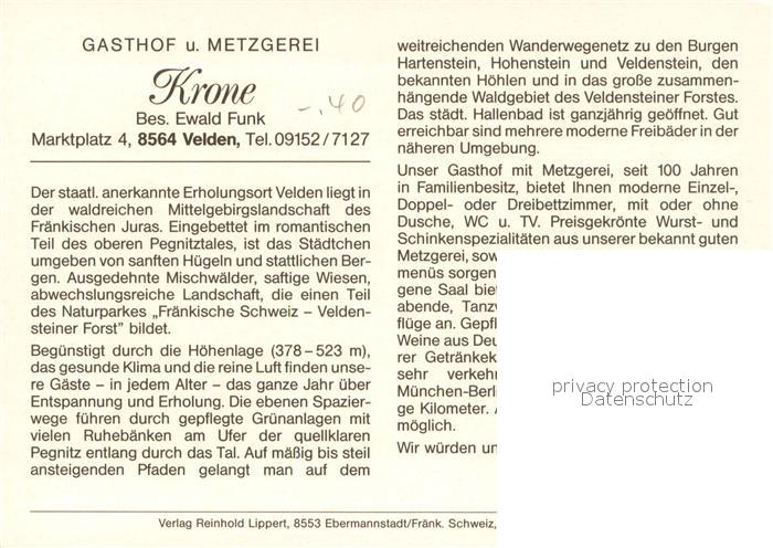 73653571 Velden Mittelfranken Gasthof Krone Gaststube Gaestezimmer Panorama postalisch nicht gelaufen Werbekarte (keine Postkarte) Erhaltung siehe scans [WerneD78] KatCode: 11110009574160