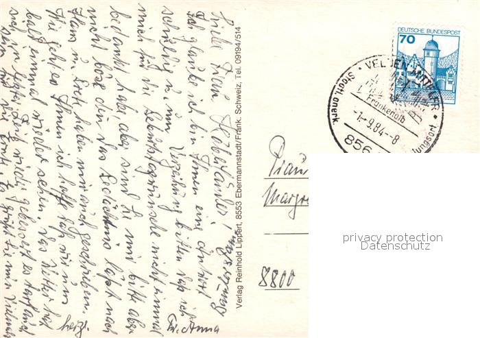 73214799 alte Postkarte Velden Mittelfranken Ortsmotiv mit Kirche Torturm postalisch gelaufen Erhaltung siehe scans [FriedD77] KatCode: 11110009574160