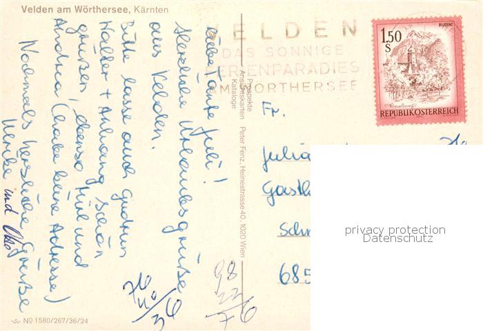 73856029 alte Postkarte Velden Woerthersee AT Ansicht vom See aus postalisch gelaufen Erhaltung siehe scans [FriedD77] KatCode: 11390211020725