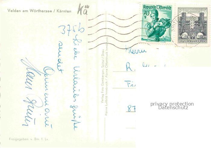 74156494 alte Postkarte Velden Woerthersee AT Woerthersee See Fliegeraufnahme Ortschaft Berge Wald Wiesen Haeuserzeile postalisch gelaufen Fliegeraufnahme Erhaltung siehe scans [Karloger] KatCode: 11390211020725