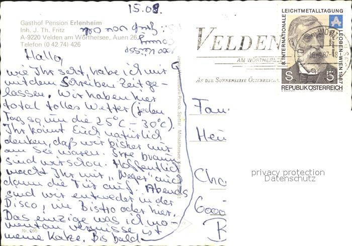 72430288 alte Postkarte Velden Woerthersee Gasthof Pension Erlenheim postalisch gelaufen Erhaltung siehe scans KatCode: 11390211020725
