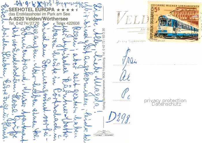 72900438 alte Postkarte Velden Woerthersee Seehotel Europa Fliegeraufnahme postalisch gelaufen Erhaltung siehe scans [FriedD77] KatCode: 11390211020725
