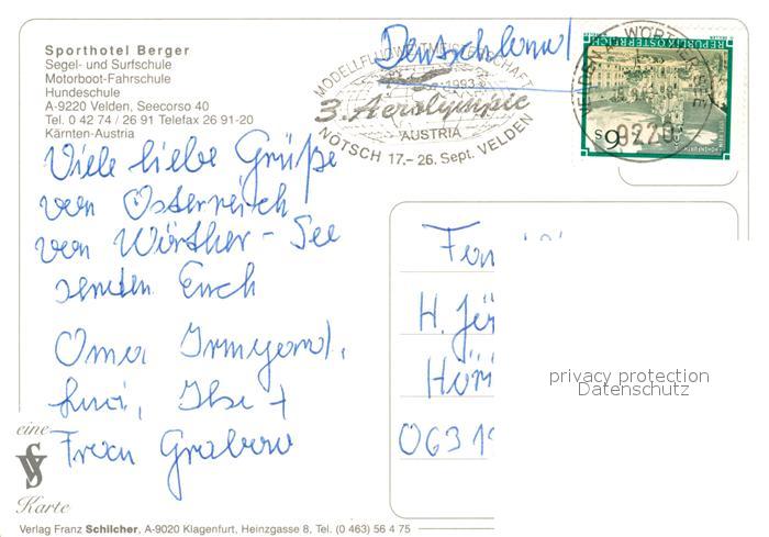 73231795 alte Postkarte Velden Woerthersee Sporthotel Berger Segeln Surfen postalisch gelaufen Erhaltung siehe scans [LiesaD40] KatCode: 11390211020725