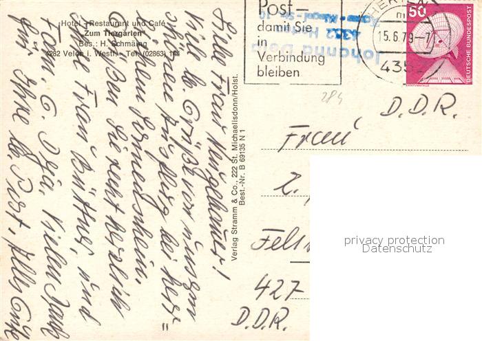 73568897 alte Postkarte Velen Hotel-Restaurant Zum Tiergarten postalisch gelaufen Erhaltung siehe scans [PaolaD17] KatCode: 11110005554064